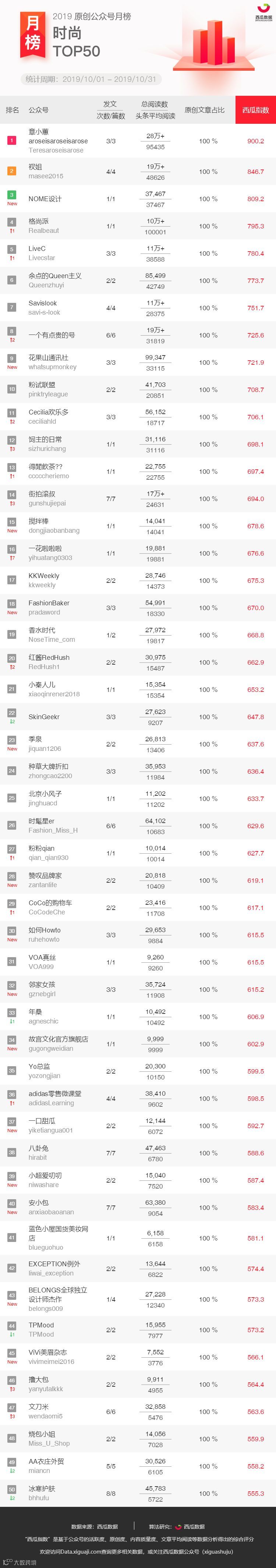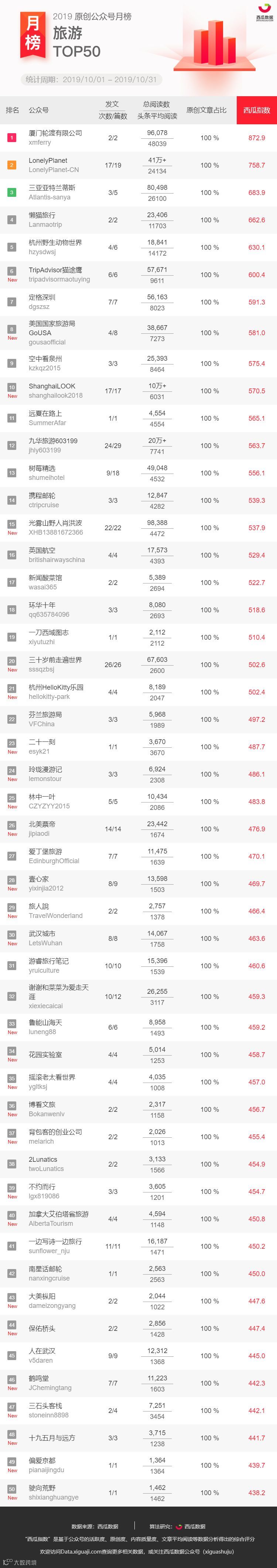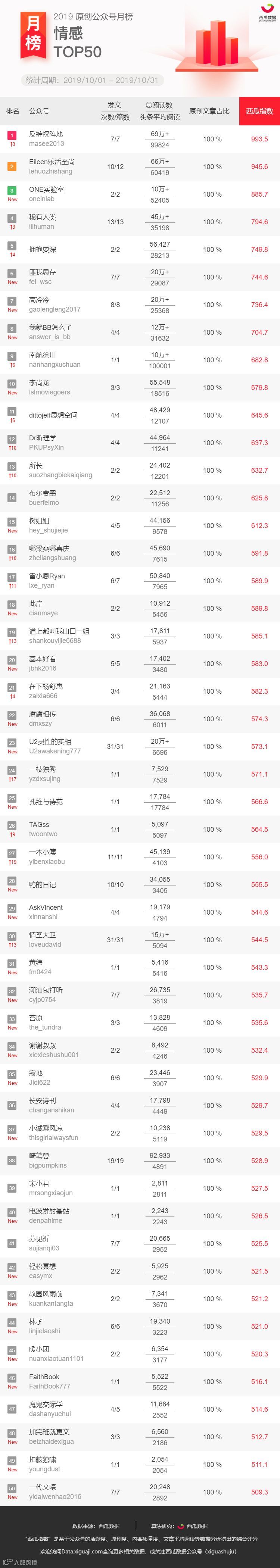 西瓜数据发布 2019 年 10 月原创公众号排行榜,分别从西瓜指数、原创文章占比、周期内公众号发文次数、发文篇数、总阅读数、头条平均阅读数等方面展示公众号数据。