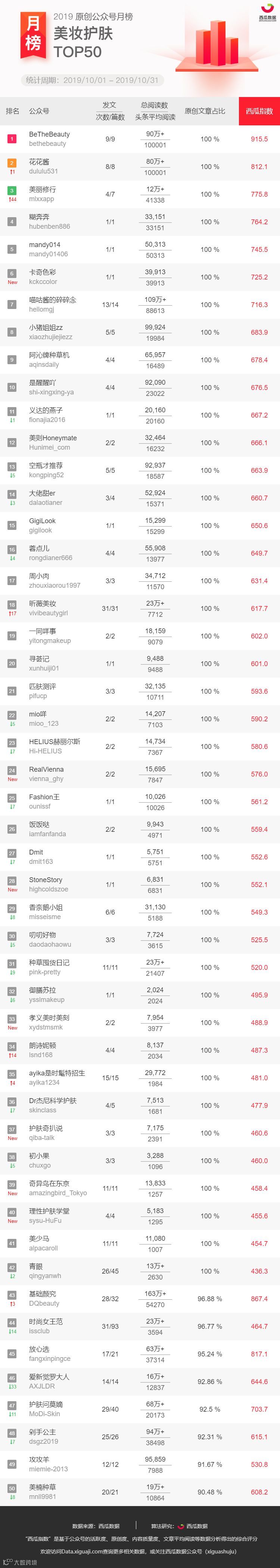 “美楠种草 ”, 在 10 月推文中原创文章占比 90.48% ,以西瓜指数 608.2 排名本期美妆护肤榜单第 50 位 。
