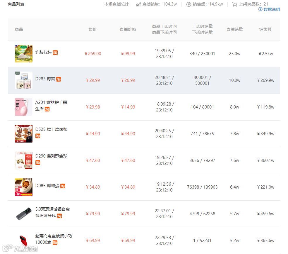 点击这场带货直播的详情,可以看到更多关于这场直播数据,比如商品信息。可以看到辛巴带货的种类非常丰富,有护肤用品,有美食,还有数码产品。而且带货销量都是以万计算,飞瓜数据快手版帮你准确记录电商数据,了解快手达人带货能力。