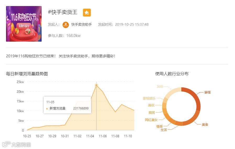 热闹的双十一落下帷幕,各大电商都取得超过往年的历史好成绩,当然快手平台也不例外。但值得注意的是,快手的购物节并未设置在11月11日当天。