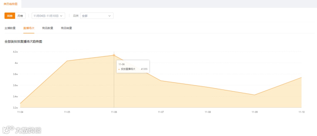 这是快手想打造的属于自己的狂欢购物节,它更强调实际的卖货和转化。通过飞瓜数据快手版的大盘数据分析也可以看到,11月6日的直播场次是上周最高的。