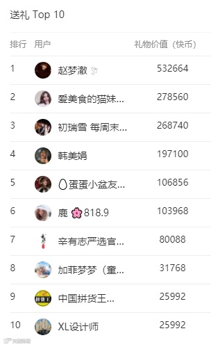可以看到辛巴妻子初瑞雪送了26.9万的快币,结合直播数据分析可以看到这个送礼物让初瑞雪成为辛巴直播间礼物榜的第三名。