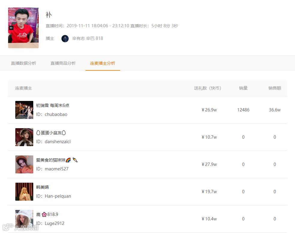 最近飞瓜数据快手版上线了新功能,连麦播主分析。可以看到所有和辛巴连麦的播主,以及它们给辛巴送礼的数据。