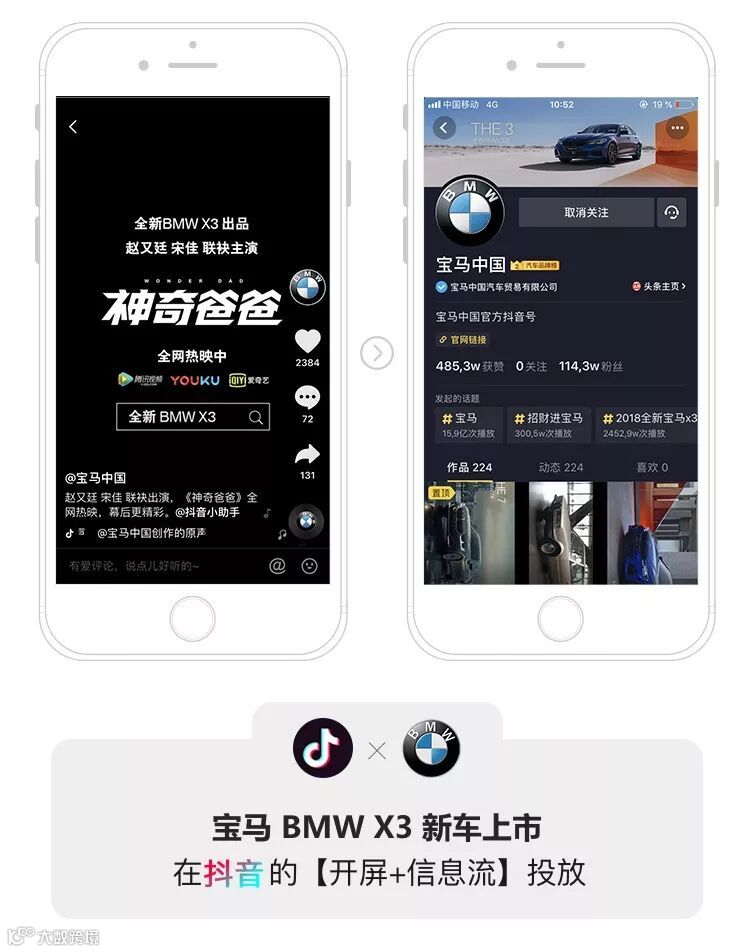 宝马BMW X3 在新车上市超级品牌日之际,在 抖音 上进行了一次「开屏+信息流」投放,在为品牌创造了巨大的传播声量,也创造了“强曝光,高互动,粉丝沉淀”等营销价值。宝马以内容协同(自制微电影),明星效应(赵又廷、宋佳参与),配合品牌传播共振,开启短视频营销新篇章。其中 “开屏+信息流4-1” 的黄金传播组合霸屏,打造宝马BigDay,同时导流至宝马中国馆抖音品牌主页,形成品牌短视频长效营销洼池。