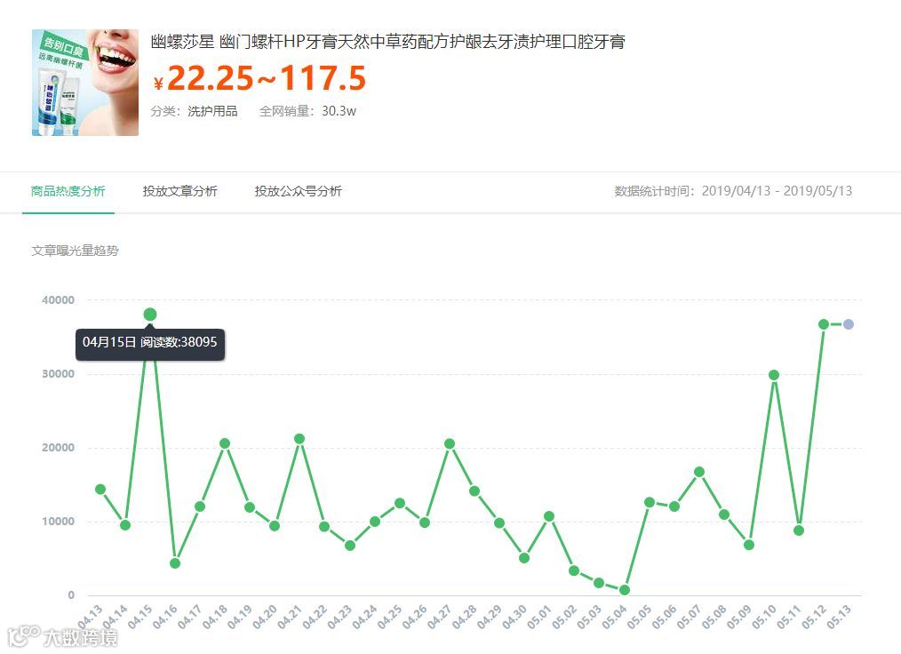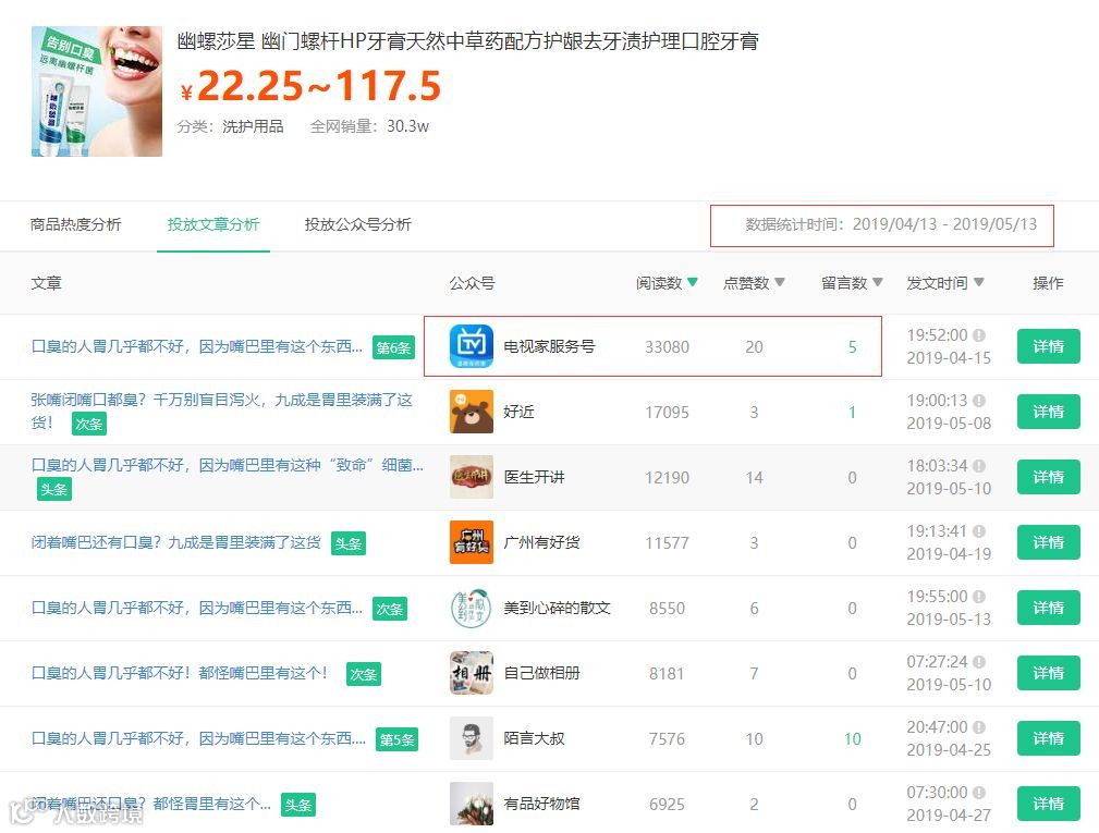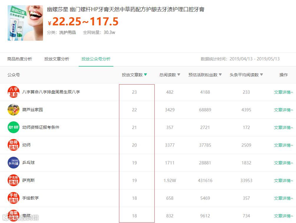 根据前面搜索结果显示:该款牙膏30天内投放的文章数是1651篇,总共投放848个公众号,这说明了商品文案有在多个账号上进行复投。