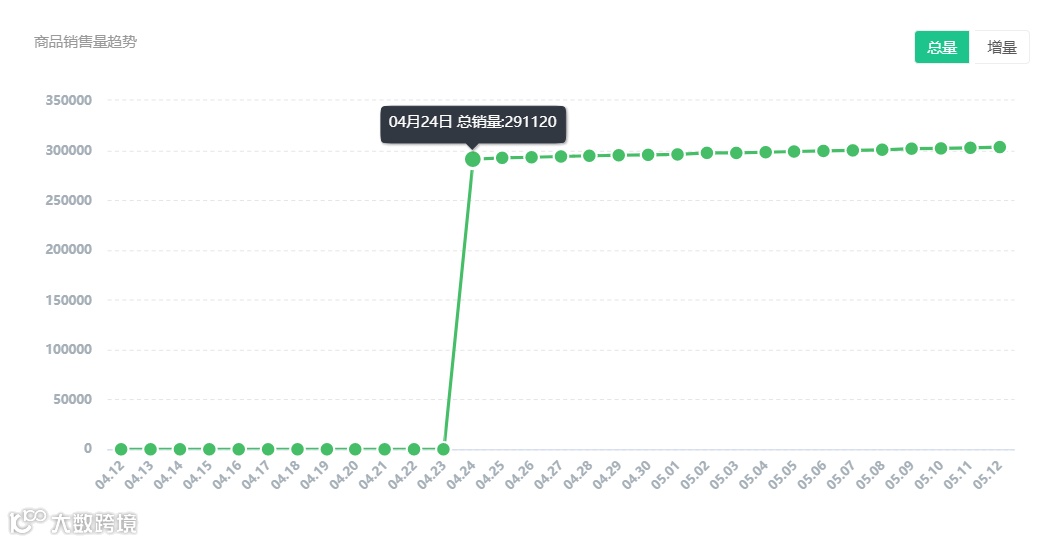 而且可以发现该商品销售量处在一个小范围反复波动的状态,平均每日增量在600单左右。目前豪华版可查看近30天的商品文章曝光的趋势,企业版支持近90天的数据查看。
