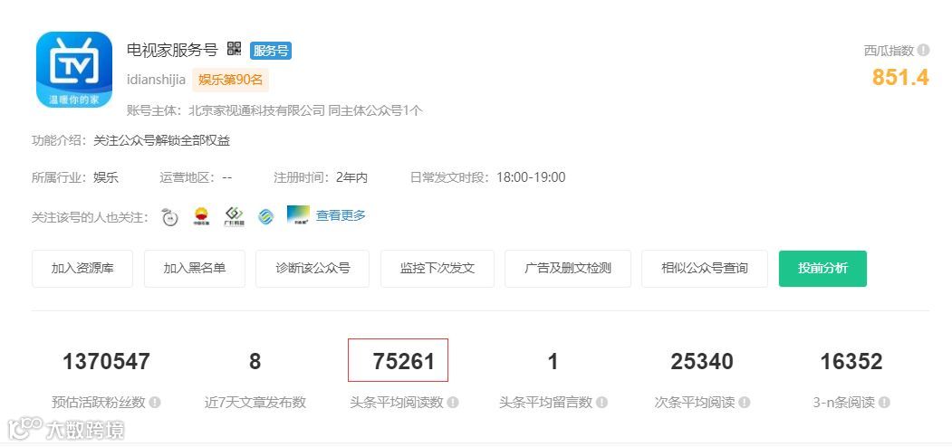 通过投放文章数据分析可以了解:该商品15号的曝光量大部分是来源一个名称为【电视家服务号】的公众号。