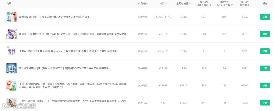 根据搜索结果展示,我们发现洗护类上目前卖得最火的商品是一款叫“幽螺莎星”牙膏,全网销量达到30.3W。而牙膏刚好跟你要投放的电动牙刷是同类别,但又不属于竞品,满足你之前的要求。