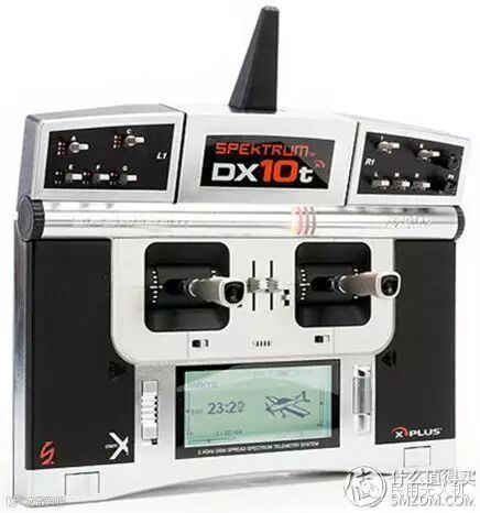 DX10t (在售),Spektrum的欧式板控。(欧式板控特征是遥控多以用挂带挂在胸前,采用双指捻杆方式进行遥控,而普通板控则是双手握持遥控,用拇指控制两边摇杆,所以欧式板控理论上会操控更加精准,但是亦会比较大台。)