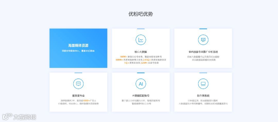 优粉吧目前收录公众号500万+,基本覆盖全行业有效账号,积累了庞大的公众号数据资源。正是基于这样的大数据优势以及AI学习能力,优粉吧可对海量公众号进行语义识别和数据分析,实现了品牌广告和公众号的精准匹配。