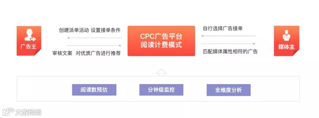 品牌主在平台创建投放计划,设定广告文案、预算和单价等信息,平台通过分析其广告类型、预算空间、受众人群等,在24小时内完成审核,将广告精准匹配给优质媒体。媒体主接单后,在约定日期发布广告文案,推送结束后申请结算,平台将对媒体订单进行验收和效果评定,完成验收后,品牌主将被扣除相应的订单费用。