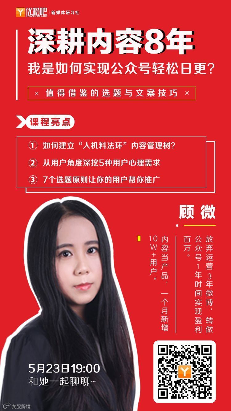 本周三(5月23日)晚19:00,顾微带着她总结了她多年的选题与文案技巧,和你一起聊聊~