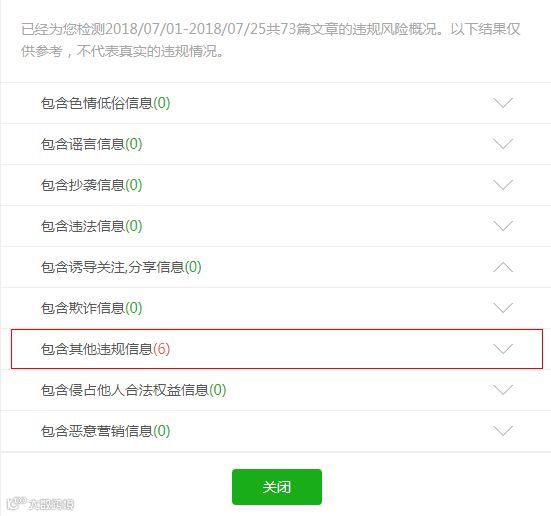 一键即可检测公众号历史文章是否存在违规风险,并告知疑似违规原因。