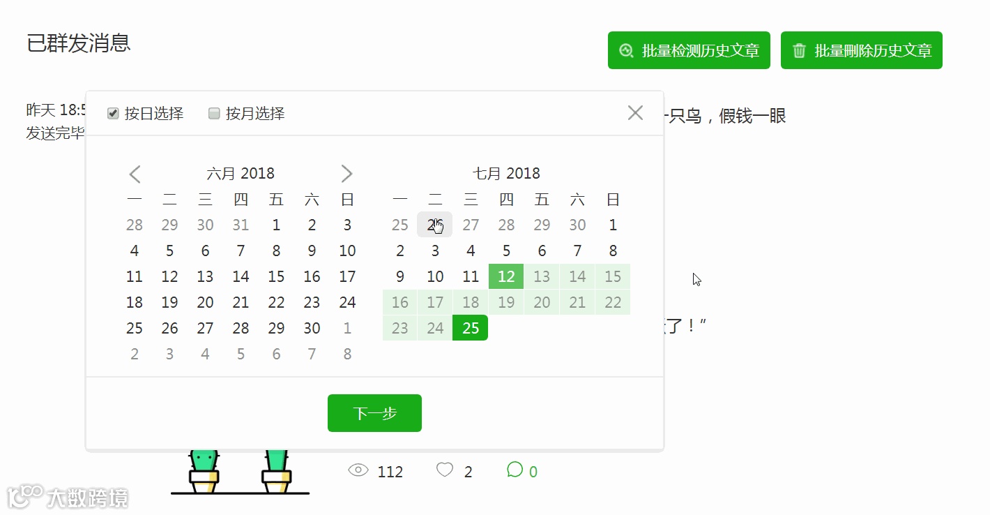 点击“批量违规检测文章”,选择“按日”或“按月”,确定好检测时间段,点击下一步,即可开始检测。