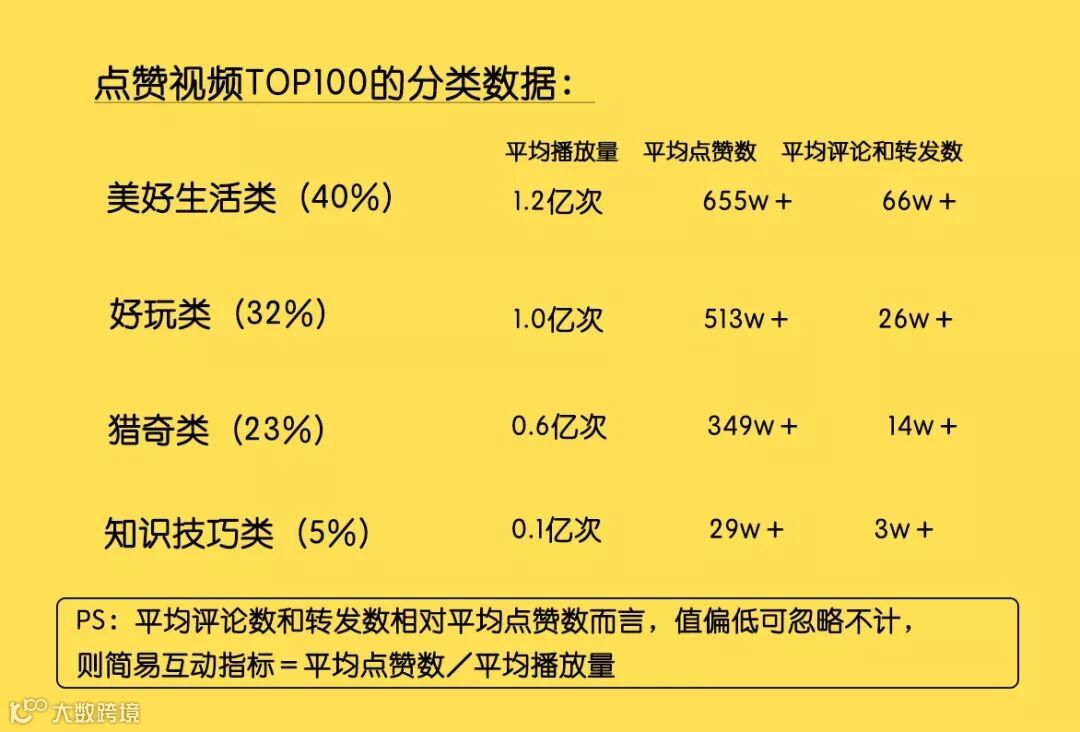 通过一个月的数据分析,海豚君发现:唯有知识分享才能有效沉淀用户。而判断优质的内容的重要指标:互动指标=(平均点赞数+平均评论数+平均转发量)/播放量。通过分析排行榜单数据情况,知识技巧型内容互动指标达到2.5以上,上推荐的概率极高;美好生活类/游戏好玩类/猎奇类的互动指标则需要达到5.5以上。