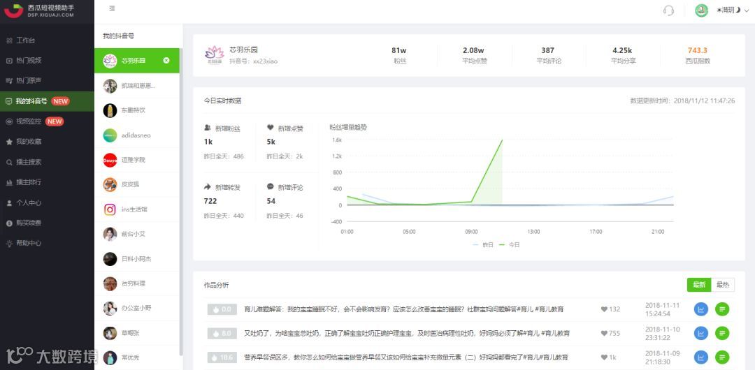 访谈间,海豚君也表示:若西瓜短视频助手早些出现就好了。基于大数据的抓取和分析,比起个人的模拟截屏方法真的是方便很多,原来还要人工统计数据,如今打开“我的抖音号”功能,一切都一目了然,实在太省心。