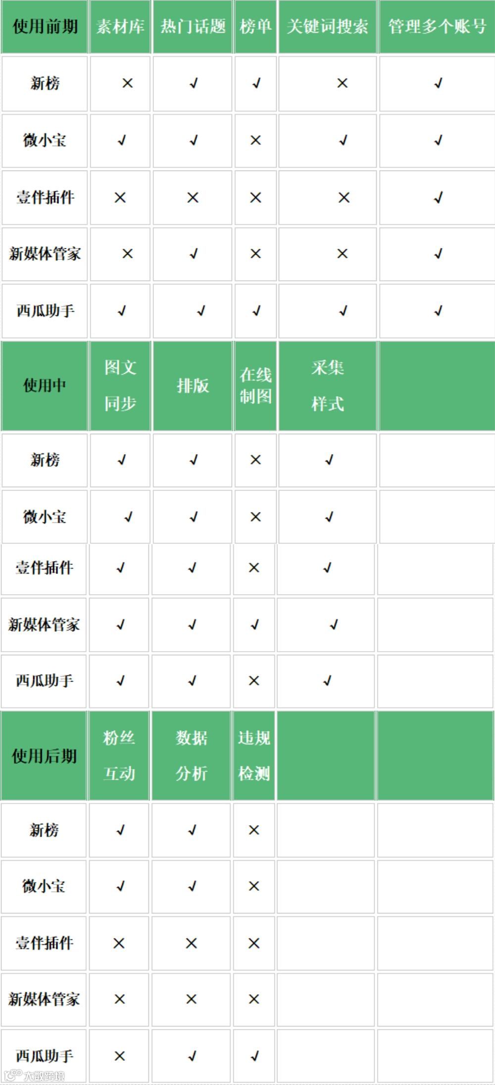 在使用前期运营者们大多需要的是捕捉热点进行选题,继而搜集素材能功能,在使用前期新榜与微小宝、西瓜助手可以满足使用需求,新媒体管家和壹伴插件类工具则无法满足。