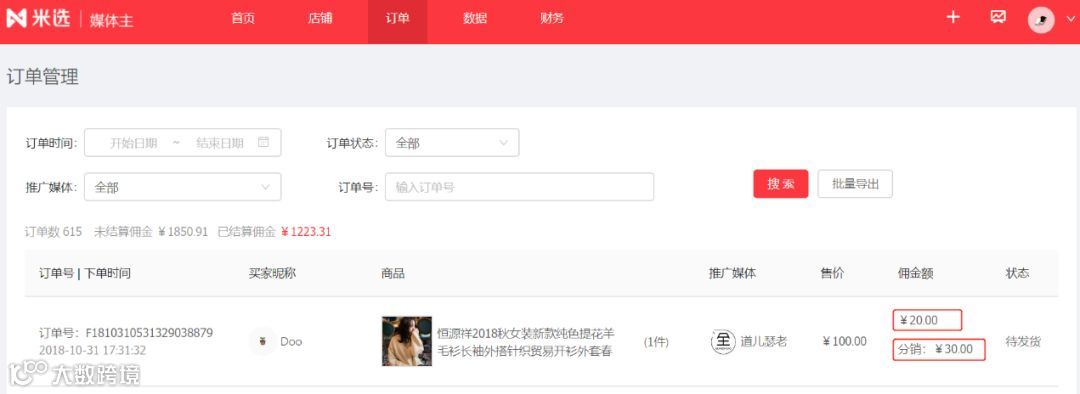 米客分享的商品产生订单,系统会为其支付分销佣金,媒体主可在管理后台查看分佣出去的金额。