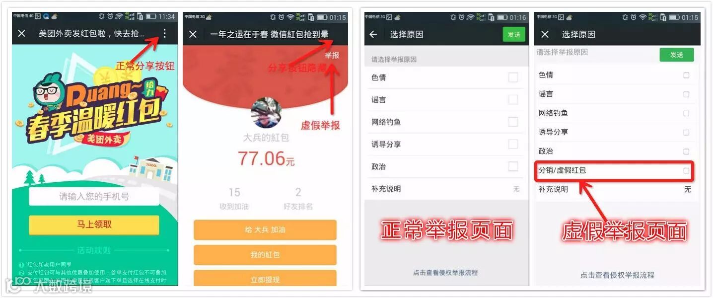 2:假红包 类似合体红包玩法,订阅号服务号都可以去做,界面做的跟真实的红包差不多,领取红包界面隐藏举报分享按钮,给你做了个举报按钮选择虚假红包,微信举报是没有虚假红包的。会有很多人上当。