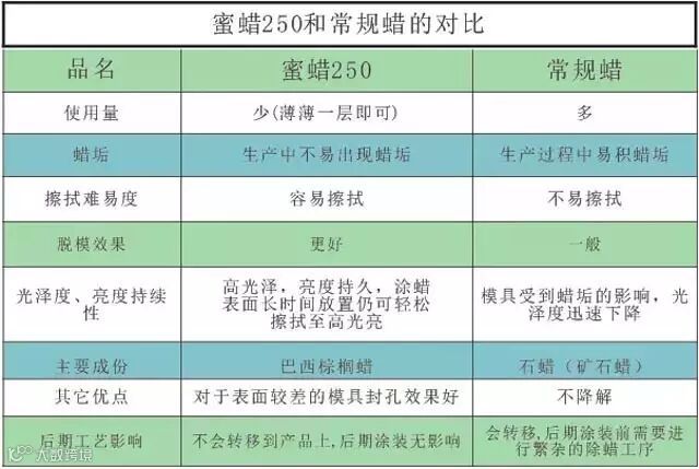 蜜蜡250高级模蜡采用巴西原产棕榈蜡合成,质量优异稳定,配方独特一次施用即可多次脱模。操作方便、用量少、 脱膜易、脱模次数多、脱模效果好并能保护模具、提供高光泽表面效果等特点,是国内应用较广的脱模产品。