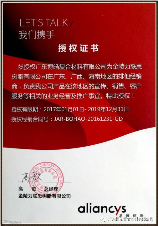 力联思是世界顶级不饱和树脂生产商,广东博皓是中国知名复合材料服务商。自2013年金陵力联思树脂有限公司授权广东博皓为排他经销商后,博皓团队刷新了力联思树脂产品在广东地区的销售历史,创造了一个又一个辉煌业绩!2017年金陵力联思再次授权广东博皓为广东、广西、海南地区的排他经销商,确立战略性合作伙伴关系,强强联手,创造辉煌!我们将以高品质的产品、全面系统的技术服务全心全意地为客户解决问题、创造价值,更好地推动复合材料行业技术创新!