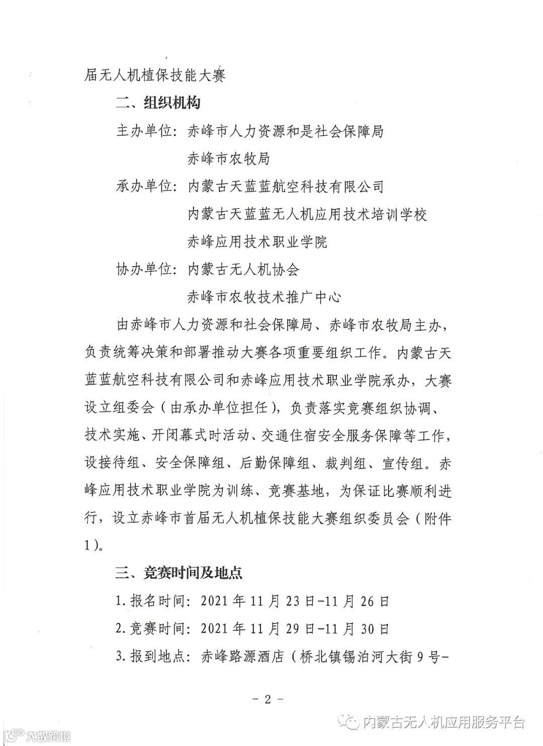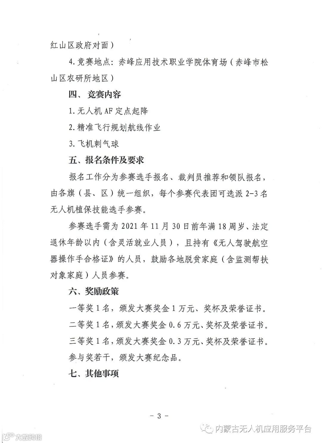 本次比赛的报名时间,奖金,比赛项目等事宜请参阅“关于举办赤峰市首届无人机植保技能大赛的通知”: