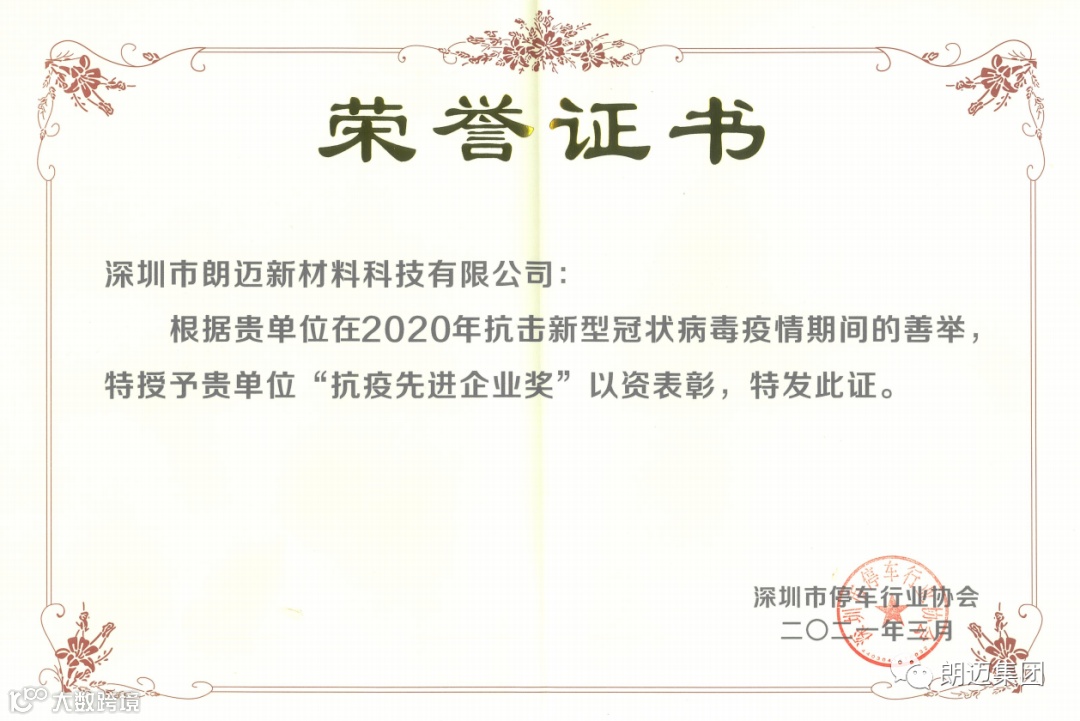鉴于我司在2020年抗击新冠病毒疫情期间给予的帮助,深圳市停车场协会特授予朗迈“抗疫先进企业奖”。