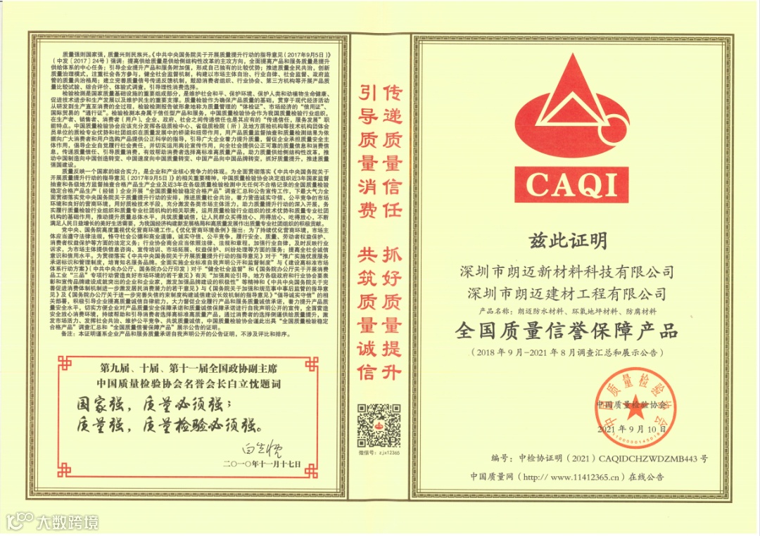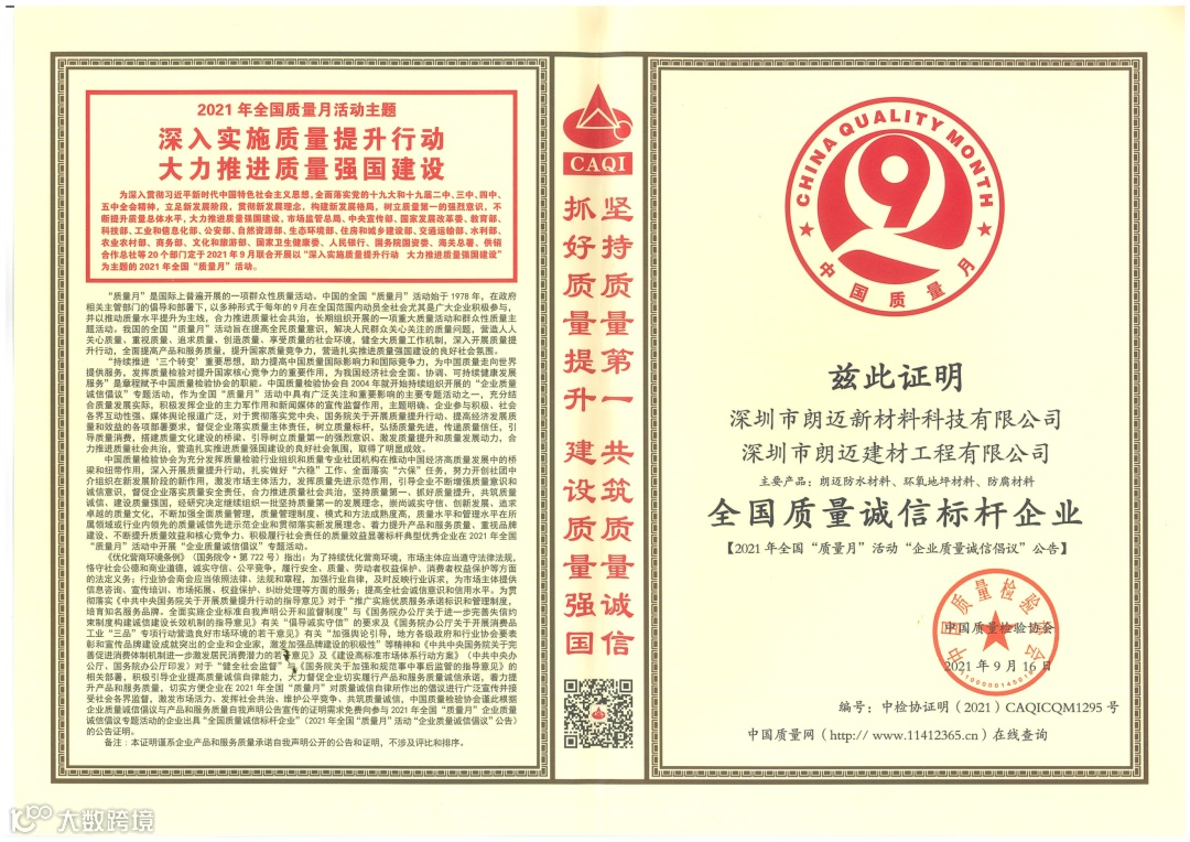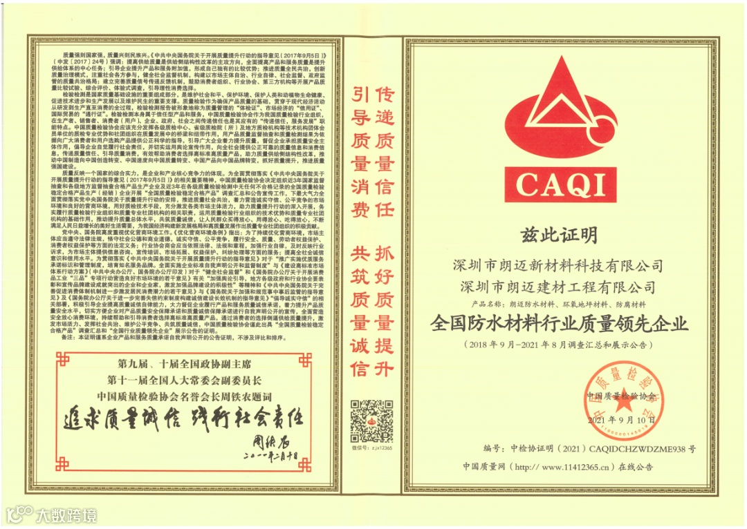 近日,国家市场监督总局等20个部委共同部署开展了2021年全国“质量月”活动。朗迈作为质量效益显著的标杆企业,受邀参加了“企业质量诚信倡议”专题活动,并获得了“全国质量诚信标杆企业”、“全国质量信用优秀企业”、“全国质量信誉保障产品”、“全国防水材料质量领先品牌”、“全国质量检验稳定合格产品”、“全国防水材料行业质量领先企业”等多项荣誉。