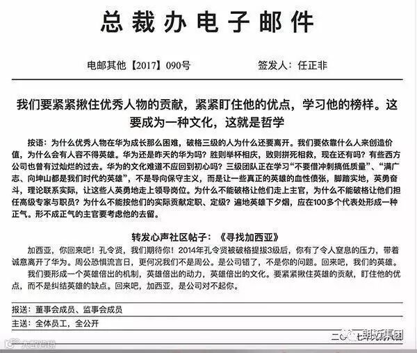 紧接着,任正非又转发了“寻找加西亚”的帖子,