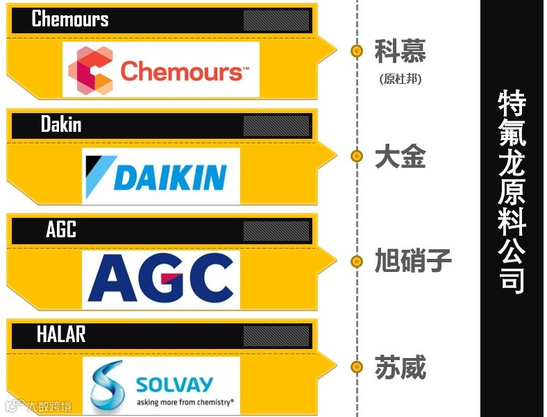 市面上特氟龙材料品牌主要为科慕(Chemours)、大金(Dakin)、旭硝子(AGC)、苏威(HALAR)。