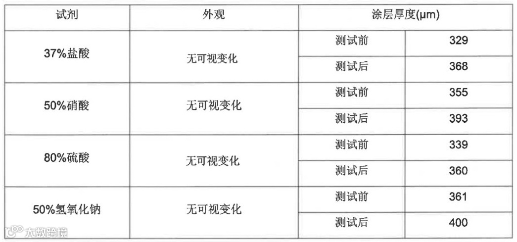 不锈钢内衬特氟龙产品经过耐化学浸渍实验、漆膜柔韧性-轴弯、及耐沸水性实验。样品浸泡在指定的化学试剂烧杯中,实验室环境条件放置7天后,对样品外观及膜厚进行检测。