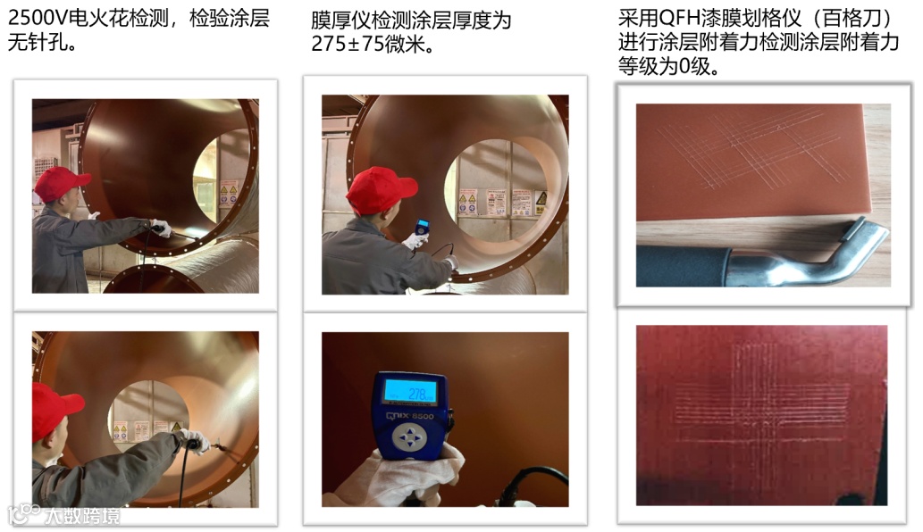 膜厚:使用膜厚仪进行涂层膜厚检测,并使用2500V电火花检测仪检漏,检测涂层是否有针孔。