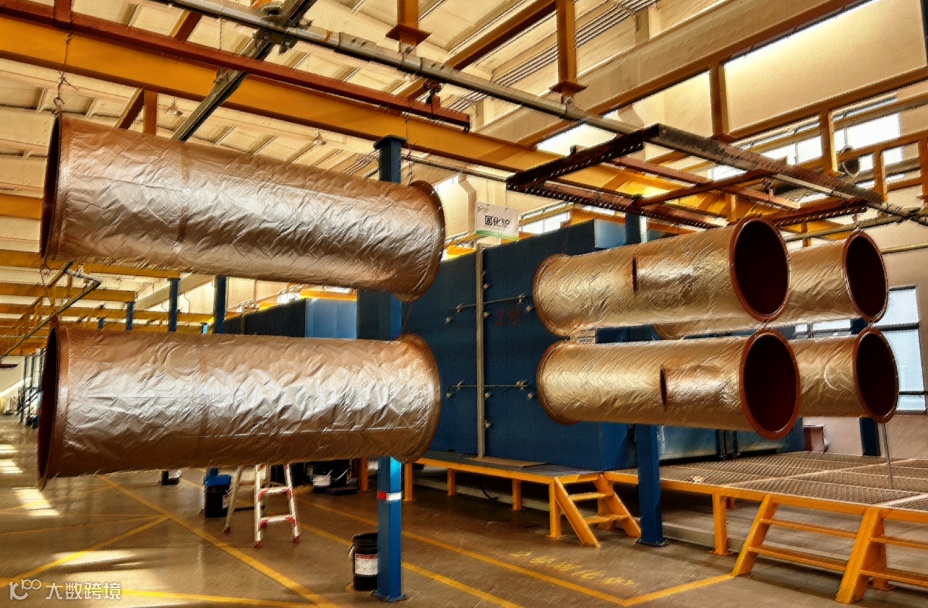 根据风管口径大小,喷涂粉量设定值不同,喷枪靠近管件内表面匀速拉伸,将涂好底涂产品推进烤炉房进行烘烤,温度设定值基于涂料类别,底面喷涂烘烤好的管件推进喷粉房进行第二次喷涂,后推进烘烤房烘烤后,再重复进行以上操作进行第三次烘烤。