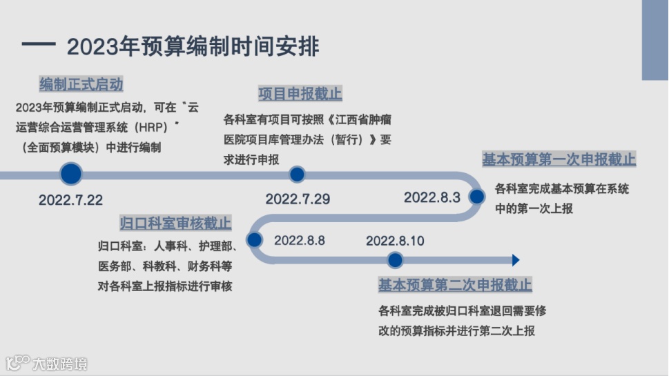 ■ 江西省肿瘤医院在编制2023年预算时,以全局统筹为基础确定了预算编制任务中的重要时间节点,保障预算编制任务可以有序完成。