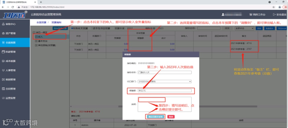 ■ 在预算编制过程中,通过卫医通智慧系统采集医院历史财务数据,分析医院收入情况和成本情况,从而为科学精准的预算编制提供参考和助力。