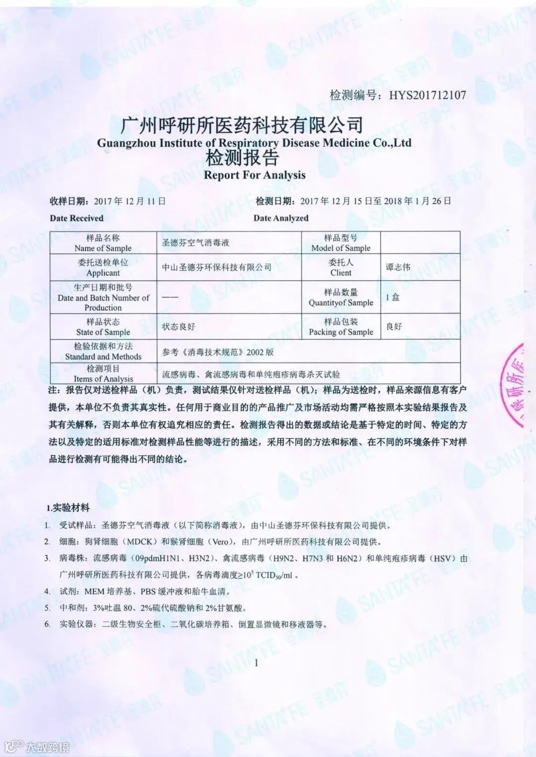 ●经过广州呼研所医药科技有限公司检测,测证实,H3N2流感,禽流感:H9N2、H7N3、H6N2等等!杀灭率同样高达99.99%。