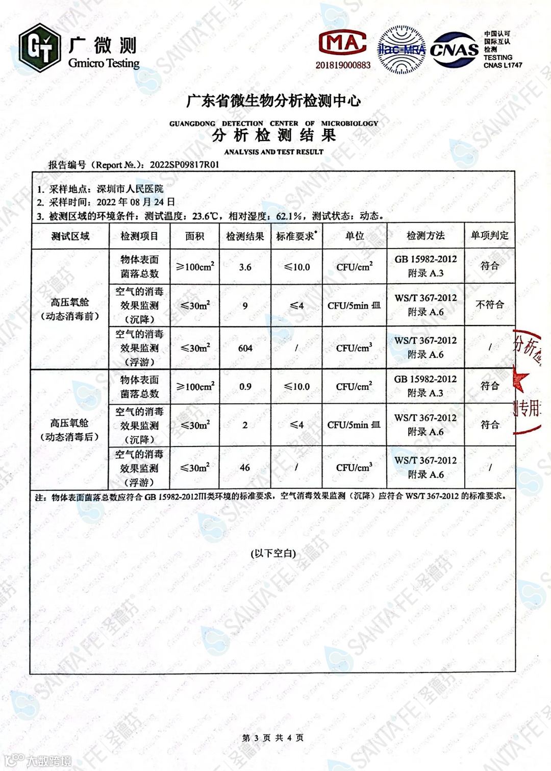 通过与深圳市人民医院的高压氧舱进行实时、动态的舱内空气净化处理(圣德芬植物抗菌空气净化系统),舱内物表、沉降、浮游菌菌落总数均大幅度下降,达到院内相关消毒(卫生)标准。