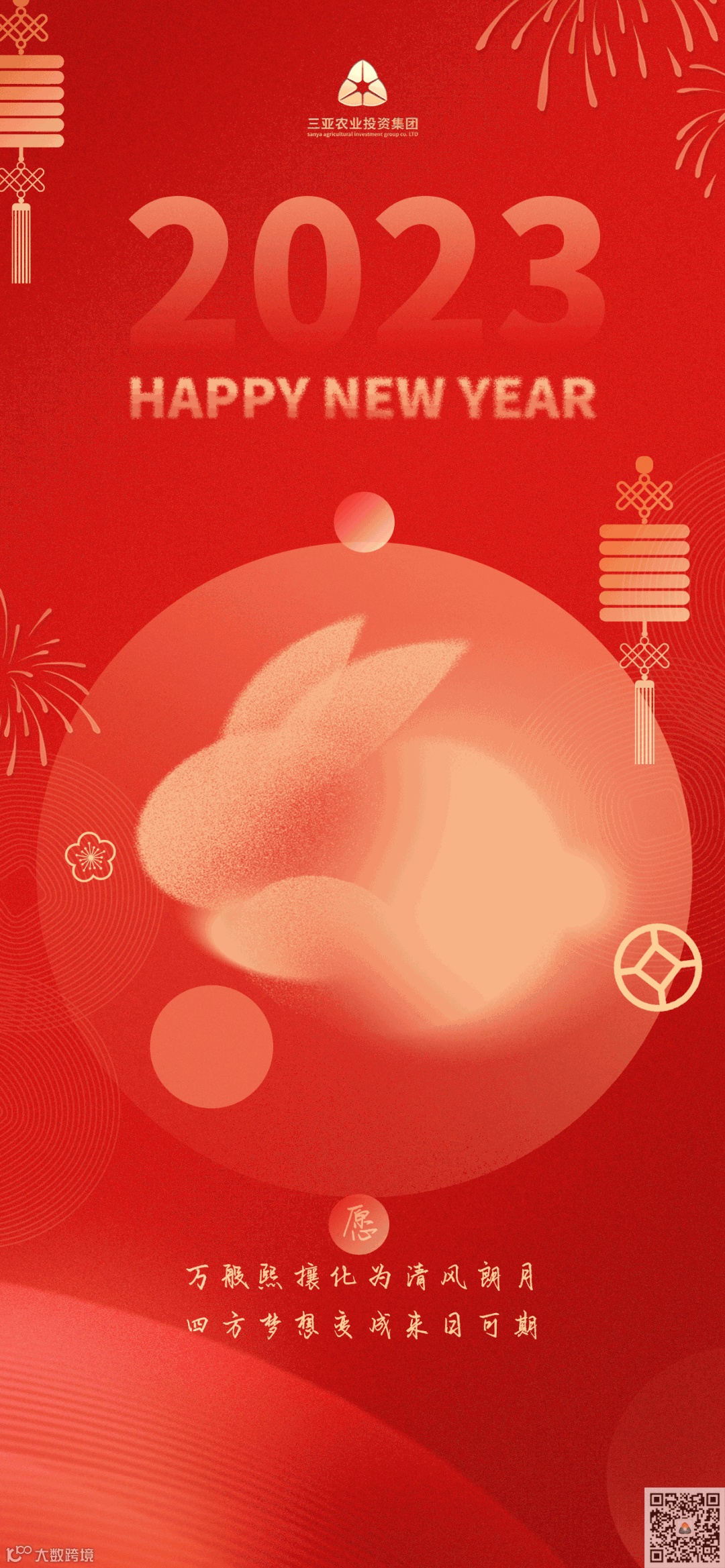 虎啸辞旧年,玉兔迎新春。感谢大家一年以来对我们的支持,籍新春佳节之际,三亚农投集团为大家献上最诚挚的祝福。愿大家在新的一年:前虎似锦宏兔展,玉兔呈祥福满堂!