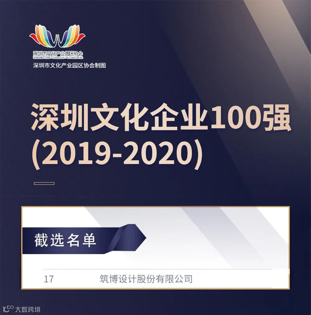 2021年4月,由深圳市文化广电旅游体育局组织开展的“深圳文化企业100强(2019-2020)”榜单揭晓,该榜单涵盖计算机、新闻出版、影视动漫、建筑设计、游戏研发等多个领域,其中不乏腾讯、创维、百度、今日头条等国际一流企业。本次筑博设计位列总榜单第17名,进一步验证了我们在深圳文化产业的综合实力和品牌价值。