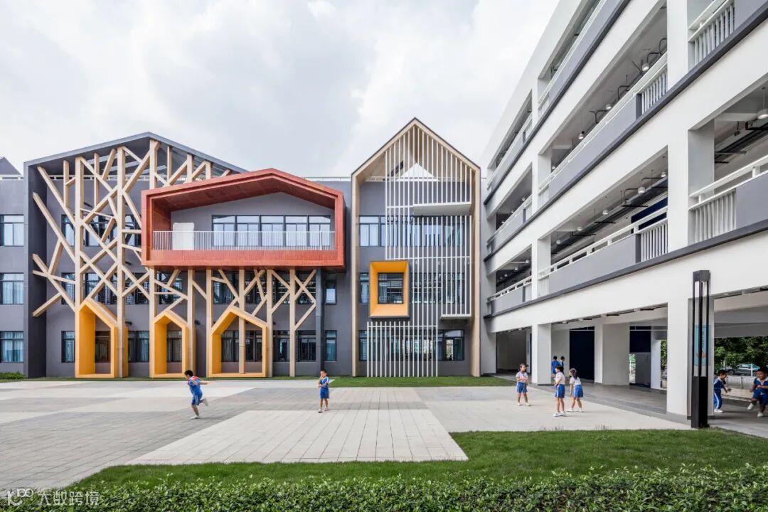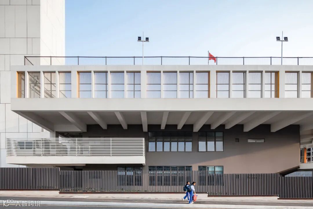 学校位于广东省茂名市共青河新城片区,规划由小学组团、初中组团及公共功能组成。针对岭南的气候高温多雨的气候特征,建筑底层充分设置架空层,层叠式的院落按年级分层,每个年级各自围绕各自的院落布置,结合二层平台以及多层次的挑台系统,为师生塑造了一个“绿色的,风雨无阻的,路径多样的绿色生态校园”。