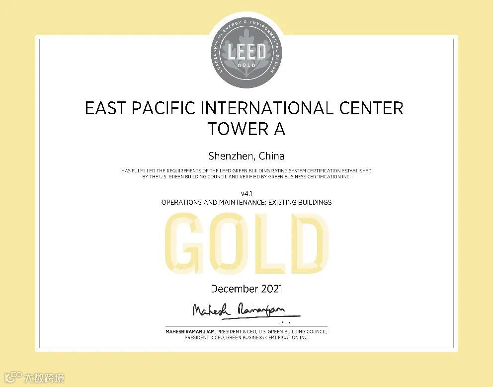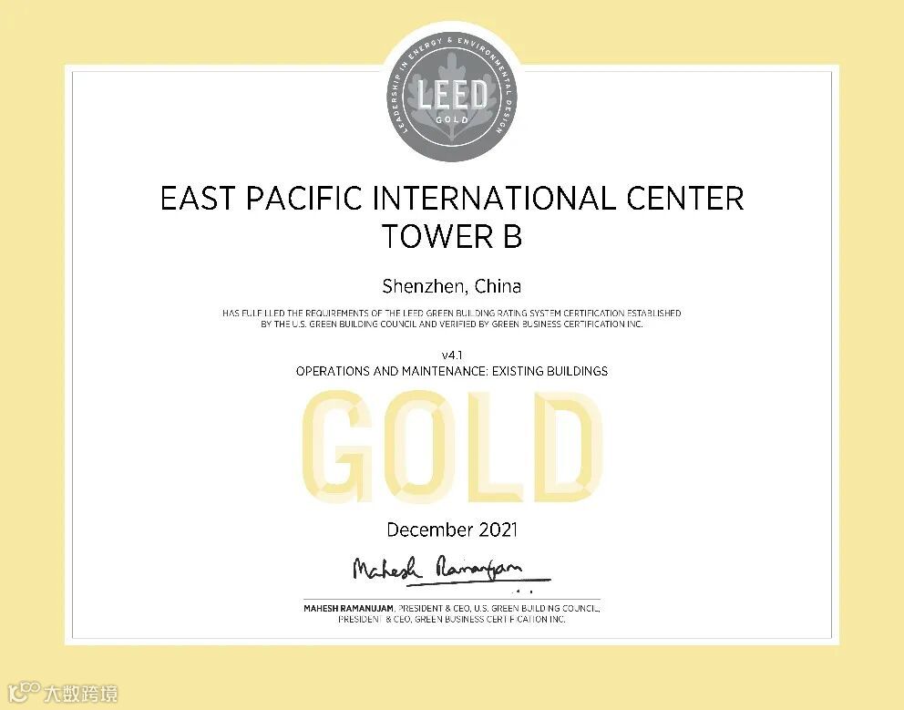 近日,由筑博科技提供认证咨询服务的东海国际中心A、B座办公楼荣获由美国绿色建筑协会(USGBC)颁发的LEED V4.1 O+M(既有建筑:运营与维护类别)金级认证证书。