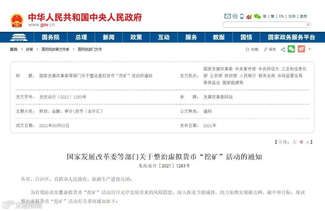 2021年9月24日,中国人民银行等十部门发布《关于进一步防范和处置虚拟货币交易炒作风险的通知》,明确了虚拟货币相关业务活动属于非法金融活动,不具有与法定货币等同的法律地位,境外虚拟货币交易所通过互联网向我国境内居民提供服务同样属于非法金融活动等规定。同日,国家发改委等部门亦发布《关于整治虚拟货币“挖矿”活动的通知》,明确禁止以任何名义发展虚拟货币“挖矿”,严禁新增项目投资建设,加快存量项目有序退出。在多个条文政策的严打下,各省市迅速反应,开始打击虚拟货币交易与“挖矿”活动。