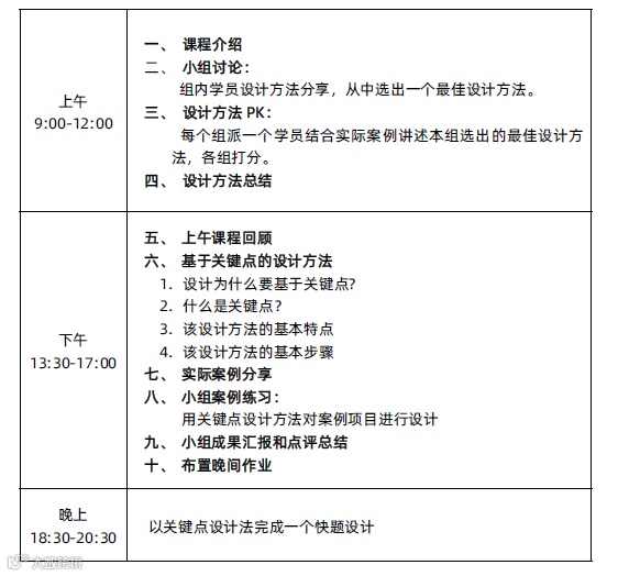 课程以讨论、讲授、练习的方式去探究设计的方法以及方法的特点、适用范围、效果等等,然后我们会一起学习一种比较普遍适用的设计方法。