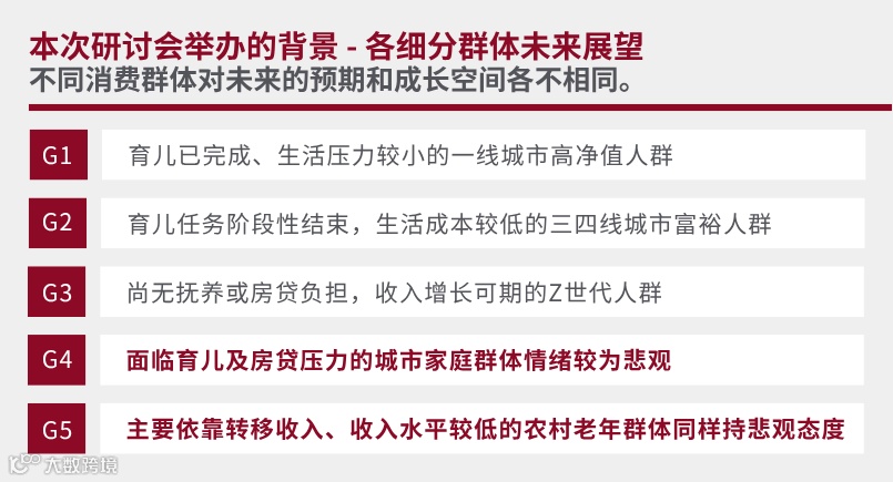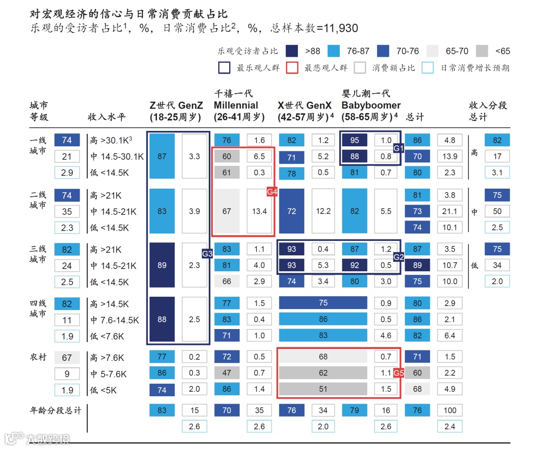 在当前经济周期下,不同消费群体对未来的信心与消费行为呈现出明显分化。一方面,Z世代年轻人与三四线城市的富裕人群对收入增长持相对乐观态度,具备一定的消费潜力;另一方面,面临育儿和房贷压力的城市家庭群体以及收入依赖转移性来源的农村老年群体,则情绪相对悲观,消费趋于理性与务实。