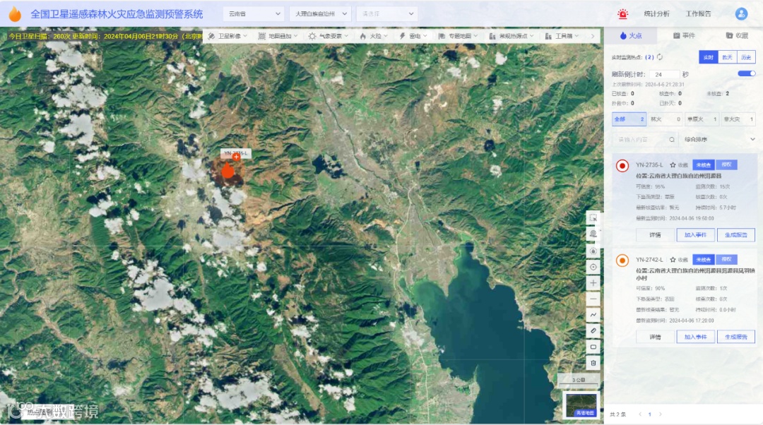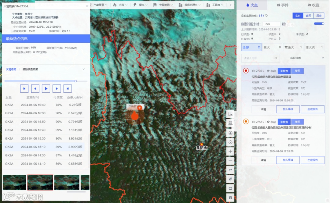 天象新亚旗下卫星遥感森林火灾应急监测预警平台最早于4月6日下午14时由静止卫星GK2A率先在云南省大理白族自治州洱源县凤羽镇发现火情,标注火灾发生地点,同时启动应急遥感监测,截止至4月6日晚22时连续监测15个时次,火灾持续6个小时,在卫星监测同时,调用火场地点周边气象资料、地形等信息,形成了火场区位遥感影像图和火情监测图。