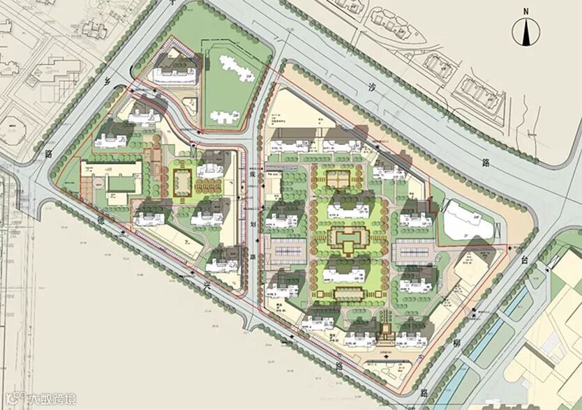 最终确定的方案两条规划路将基地分为三个组团,路的形态随地势及周边地块而变,而非生硬的切割划分。东侧大组团形态完整,围合感强,西侧小组团空间尺度适宜,顺应地势。东西组团相互呼应,强调轴线的贯通及空间的统一。方案也较好地解决了与周边保留建筑的关系。