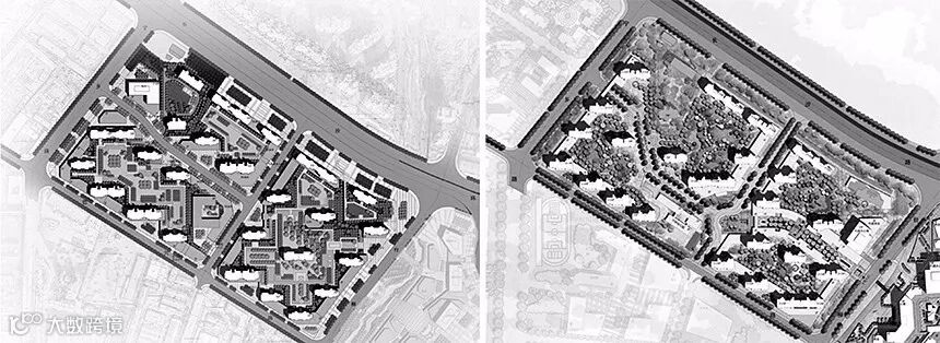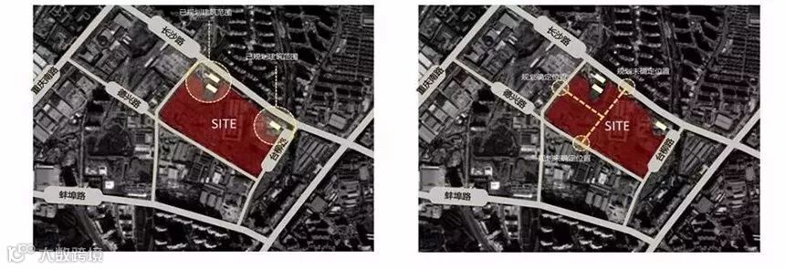 图左:基地的西北角有两栋已规划建筑,方案已确定,需为其预留日照通道;东北角为非开发地块,需同步规划设计。以上两点造成用地边界的不完整;图右:地块内有两条规划路,但路形及两个接驳口位置不确定。