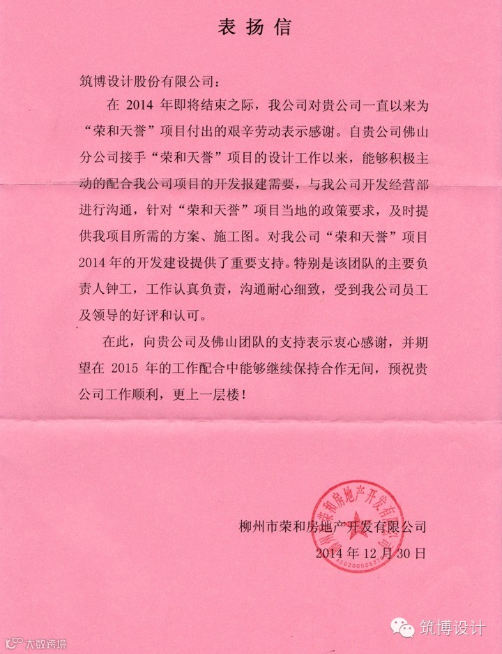 我司收到柳州市荣和房地产开发有限公司发来的感谢信。