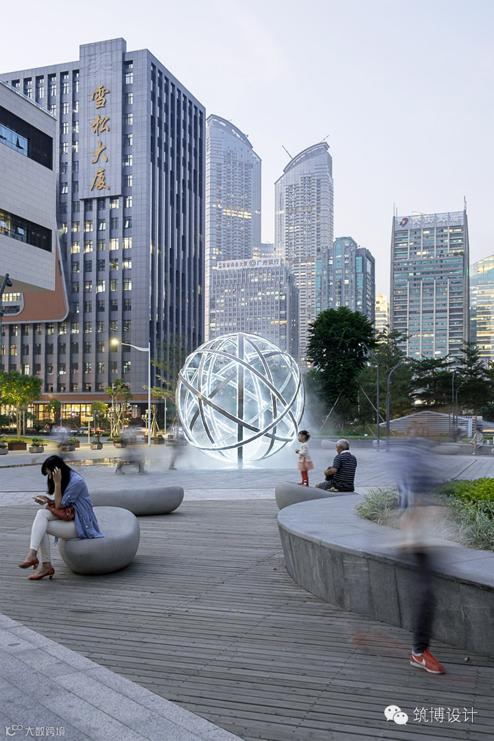 最吸引人眼球的是场地中间一个约8m高的金属球体,白天可喷出水雾降温,夜晚配合灯光效果,将金谷广场点亮为整个车公庙片区最具吸引力的活动场所。