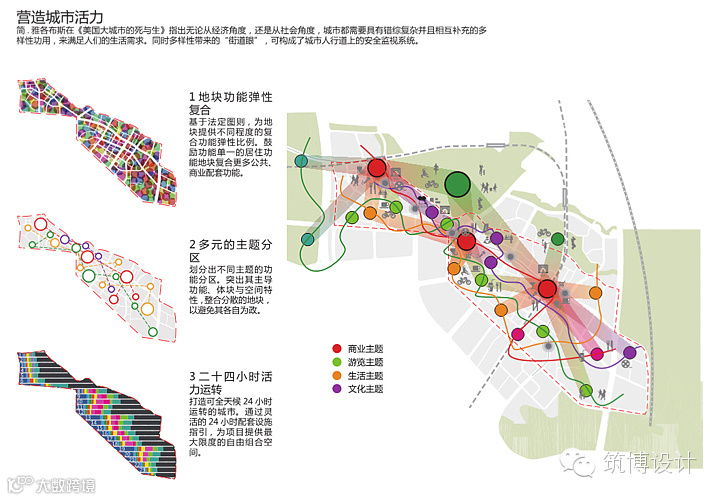 B、多元的主题分区。划分出不同主题的功能分区。突出其主导功能、体块与空间特性,整合分散的地块,以避免其各自为政。